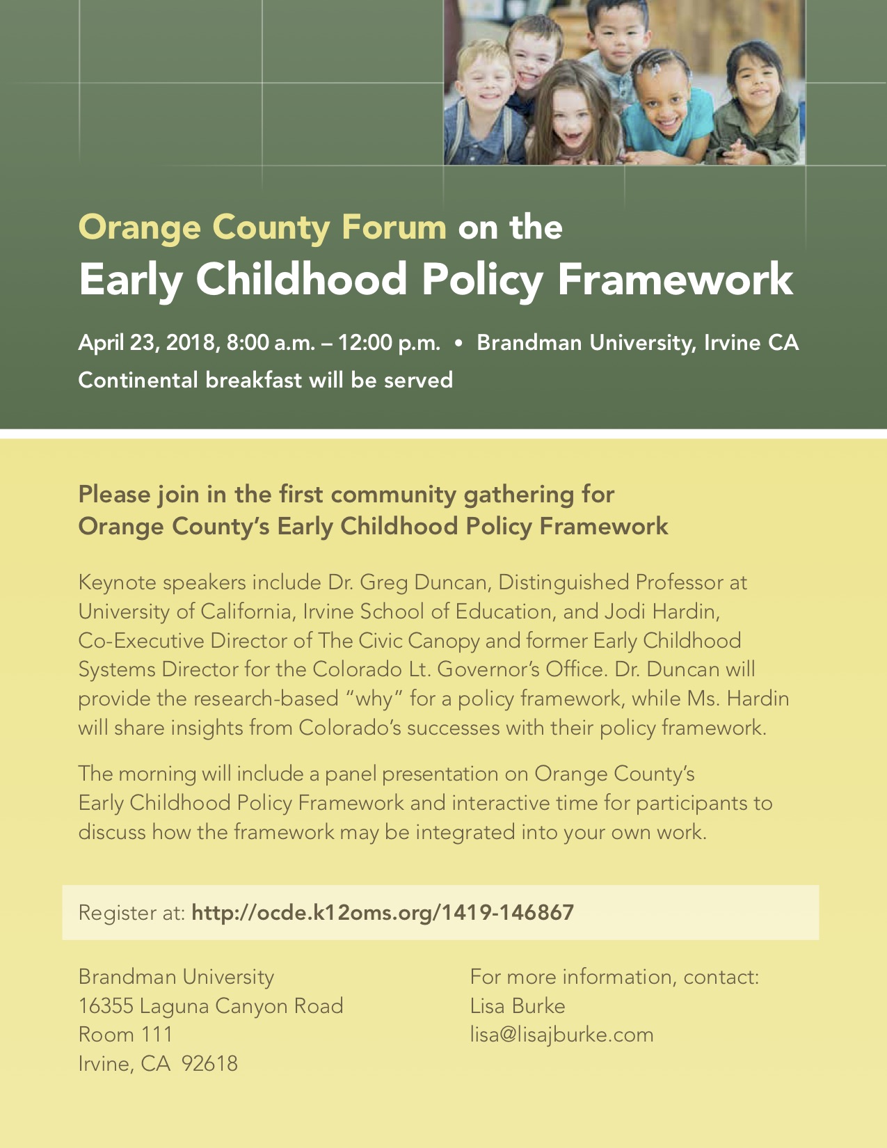 In addition to the two new Commissioner appointments, the Board of Supervisors reappointed Sandra Pierce, Director of Little Friends Preschool in Yorba Linda, in the Early Education and Early Intervention category, and Dr. Maria Minon, Vice President of Medical Affairs for Children’s Hospital of Orange County (CHOC), in the Healthy Children and Early Intervention Category at the March 27, 2018 meeting.